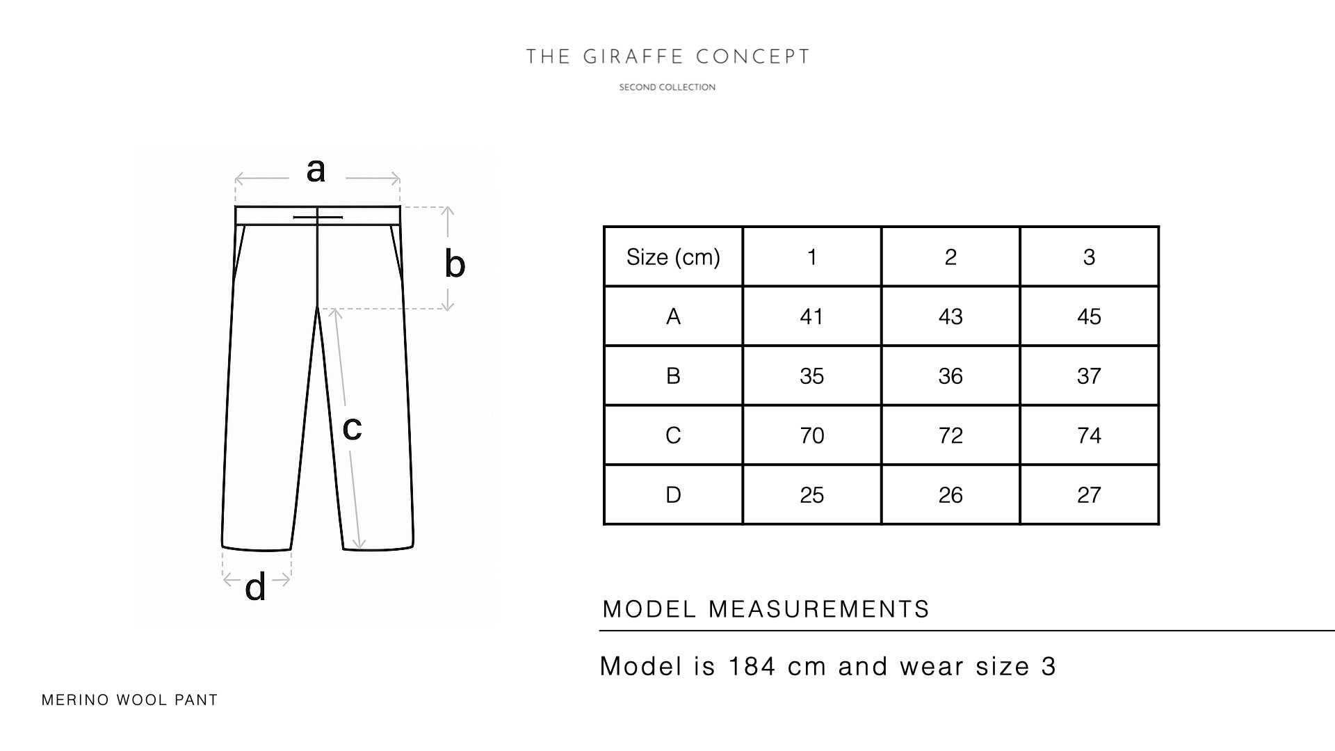 Reimagining the classic sweatpant structure, these statement pants are crafted from high-quality merino wool and lined with tailored fabric that offers softness and durability. The elastic waistband ensures a comfortable and flexible fit, while the leather strip adds a subtle detail that effortlessly elevates the garment. The center crease redefines the silhouette, bringing a touch of sophistication that lifts the casual essence to a new level of refinement. Versatile and designed to complement both relaxed and more structured looks, these pants blend functionality and elegance in a piece that embodies The Giraffe Concept’s effortless and contemporary spirit.