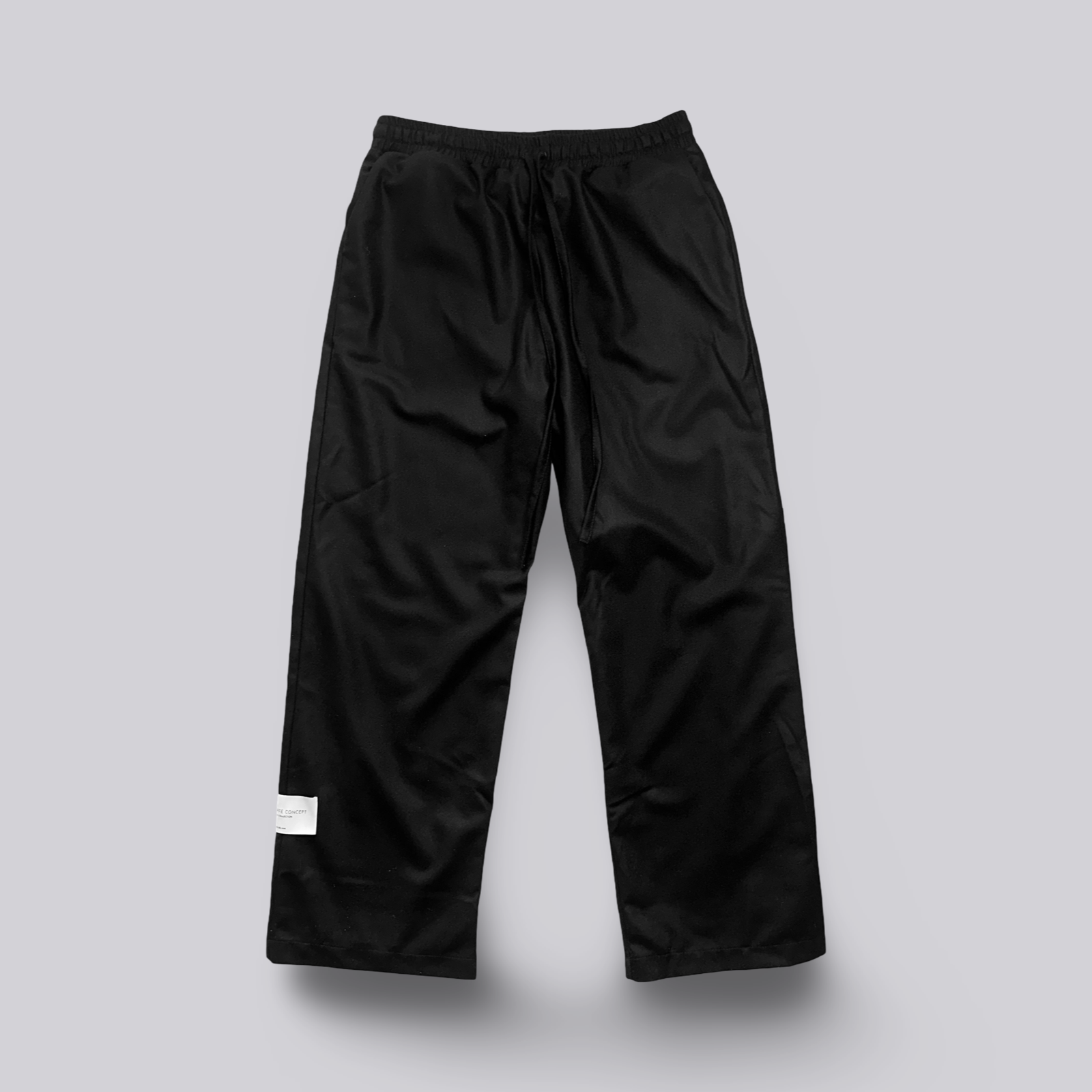 An elasticated waistband with a self-fabric belt ensures visual continuity and functionality. Rear pockets maintain a clean, utilitarian reading, while a large-format collection label introduces a conscious nod to the noise of streetwear, intentionally contrasting with the garment’s restrained design. A piece that dialogues with the collection’s tailored language, elevating the essential through proportion and materiality.